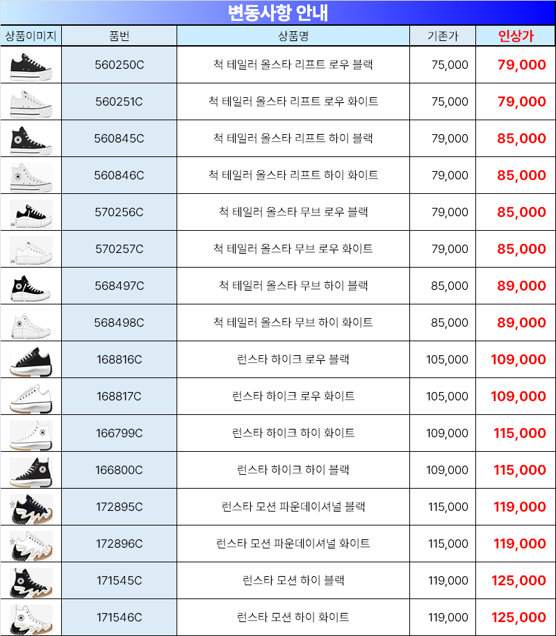컨버스 소비자 가격 변동 안내